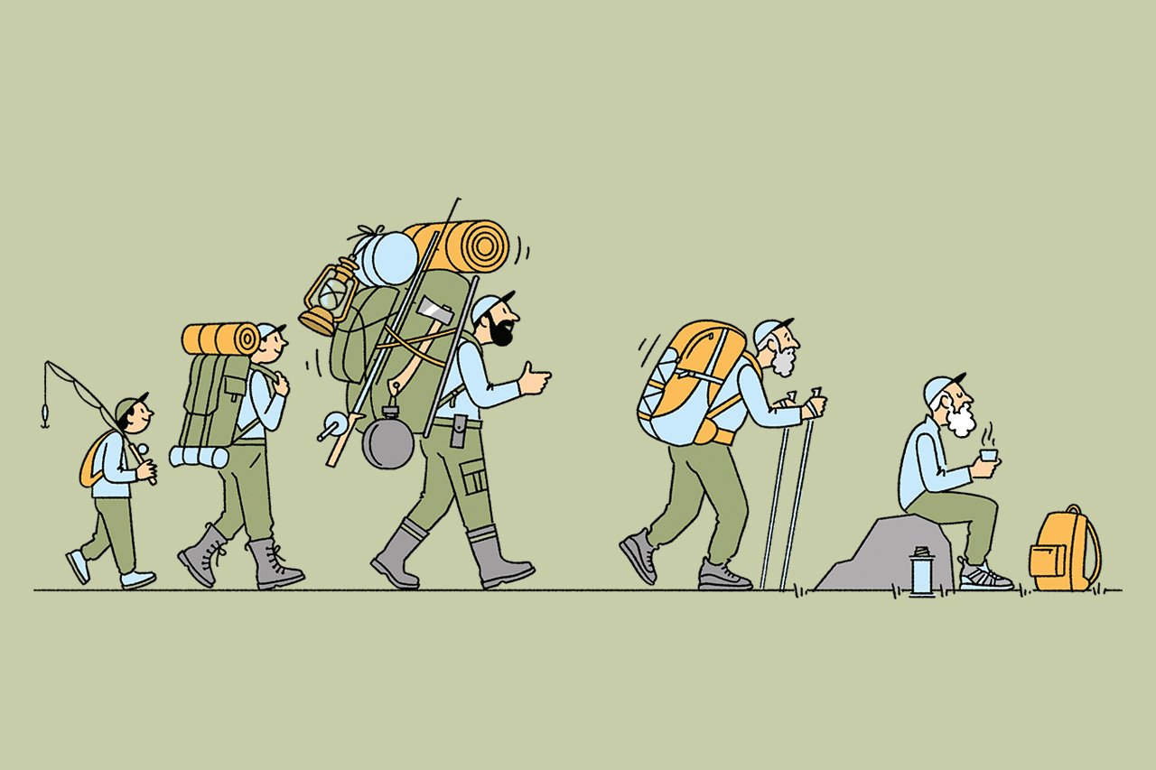65 v. jälkeen päivämatkan lyhentyneet, rinkka keventynyt, mökkiyöpymisten määrä lisääntynyt.