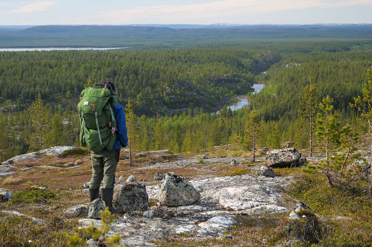 Ali Leiniö vetää saappaat jalkaan ja nostaa putkirinkan selkäänsä. Alkamassa on toista tuntia kestävä vaellusvideo Tsarmitunturin erämaassa.