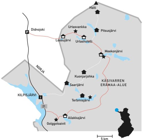 Lankalauantaina taksi jätti meidät Didnojoen parkkipaikalle. Kiinnittelimme sukset jalkoihin, minä puin ahkion vetovyön, ja vaimoni nosti rinkan selkäänsä. Lähdimme nousemaan jokivartta ylös kohti Suomea ja Lossujärveä.