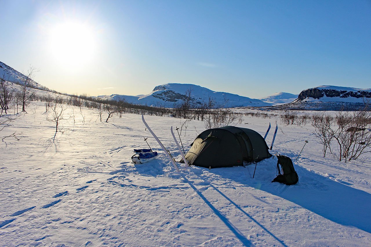 Pystytimme teltan lähelle Ailakkajokea pienen töyrään juurelle. Teltalta aukesi upea näkymä läntisille suurtuntureille. Tänään emme hiihtäneet kuin puolen tusinaa kilometriä, mutta makuupussissa hymyilimme kilpaa toisillemme: olipa upea päivä tunturissa!