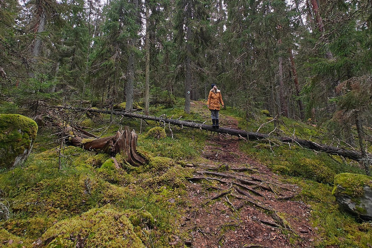 Muhkean kuusikon lisäksi huomio kiinnittyy paksuun sammalkerrokseen, joka on huolella peitellyt koko metsänpohjan alleen. Huomaavainen kulkija pysyttelee reitillä, jotta eheä luonto polun ulkopuolella säästyy kulumiselta.