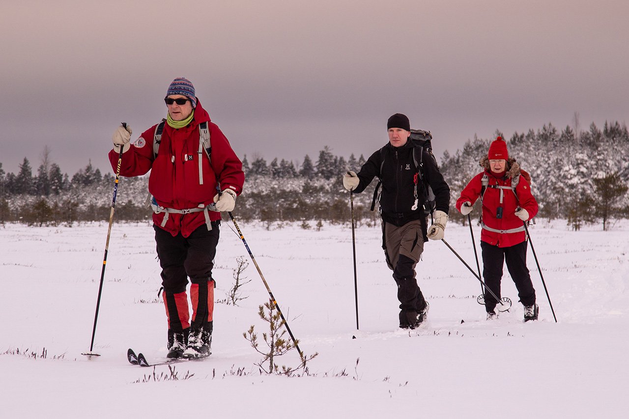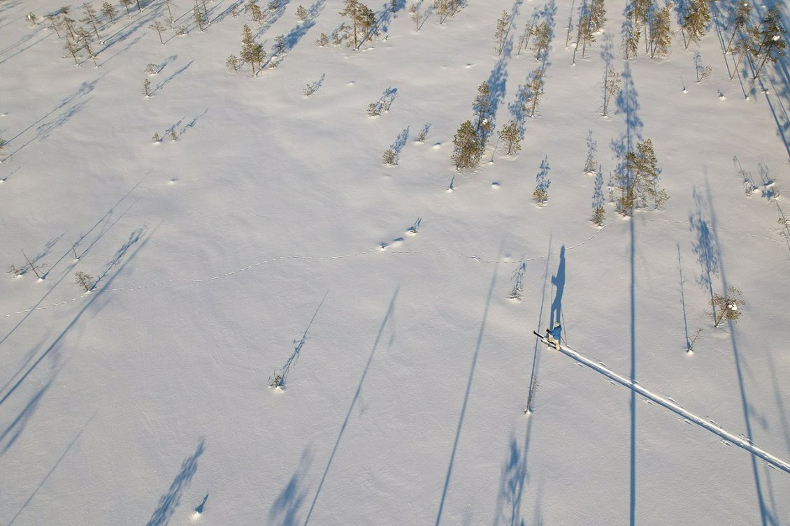 Sydäntalvella suo avautuu uudella tavalla. Se, mikä on kesällä ylitsepääsemätöntä ja upottavaa, kantaa nyt suksien alla kohmeisena ja lumipeitteisenä.
