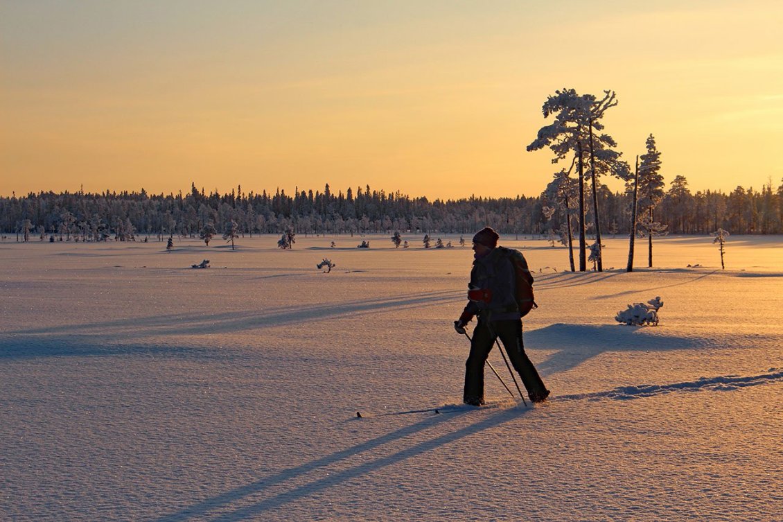 Kinnussuo–Mustinsuolla hiihdimme vaimoni kanssa kahdestaan, järkyttävän upeassa tammikuisessa pakkasäässä, jossa taivaanranta paloi keltaisena, oranssina ja pinkkinä. Hanhisuo–Teerisuolla nautin huhtikuisesta sinitaivaasta yksin.